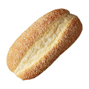 Oval shaped wheat flour soft bun glazed and topped with maize grits.