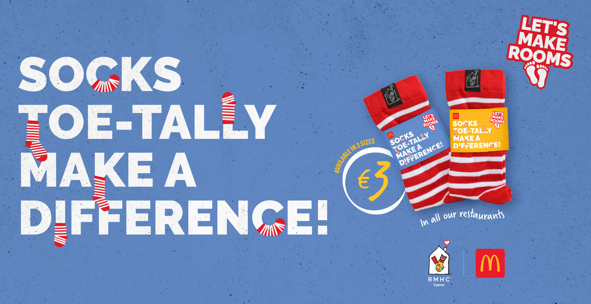 Κάλτσες για να κρατάμε τις οικογένειες μαζί! Με κάθε αγορά ενός ζευγαριού, αξίας €3, από τα εστιατόρια McDonald's, βοηθάτε να δημιουργηθούν τέσσερα επιπλέoν δωμάτια στο Ronald McDonald House.
